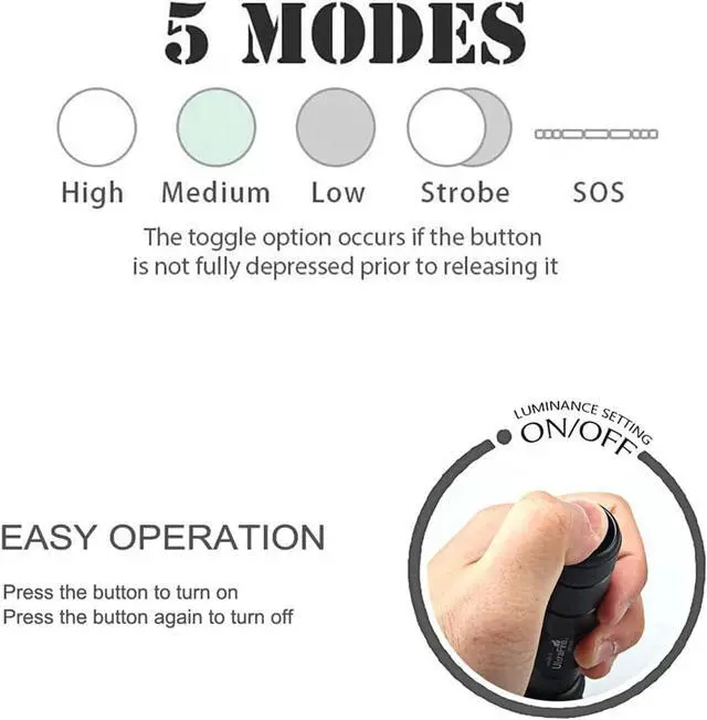 5 Modes: High < Medium < Low < Strobe < SOS. WF-502B can meet your various needs, suitable for daily use, outdoor, camping, hiking, travel, cycling and mountaineering, etc.