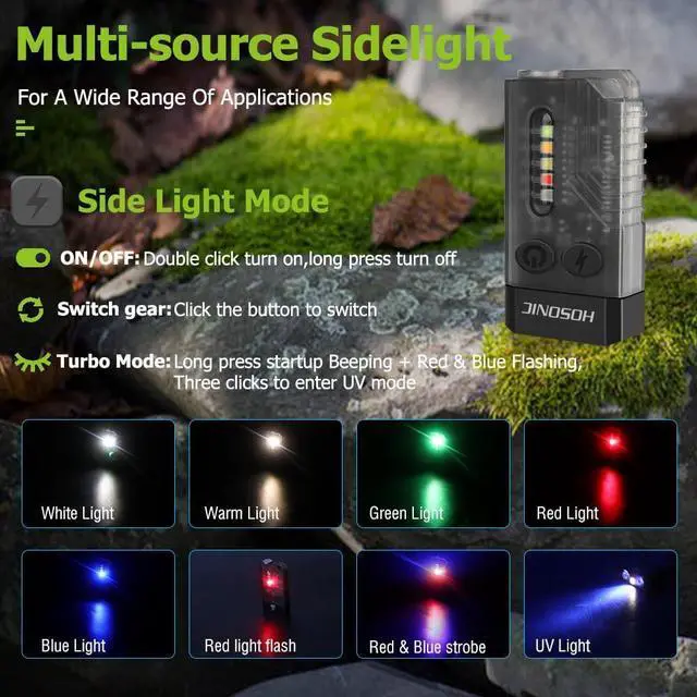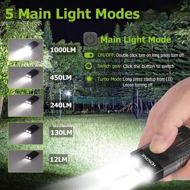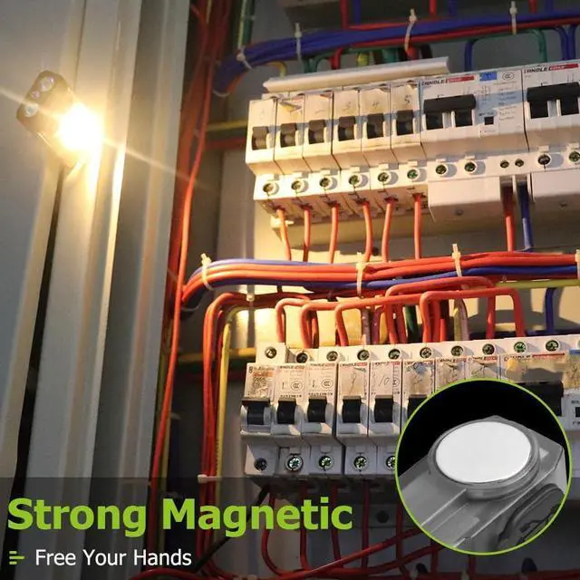 12 Modes Of Magnetic Flashlight: IPX4 Waterproof flashlight main light has 5 brightness modes: 1000LM /450LM /240LM /130LM /12LM. 7 modes of side light: white - yellow - green - red - blue - red flash - red and blue flash.
