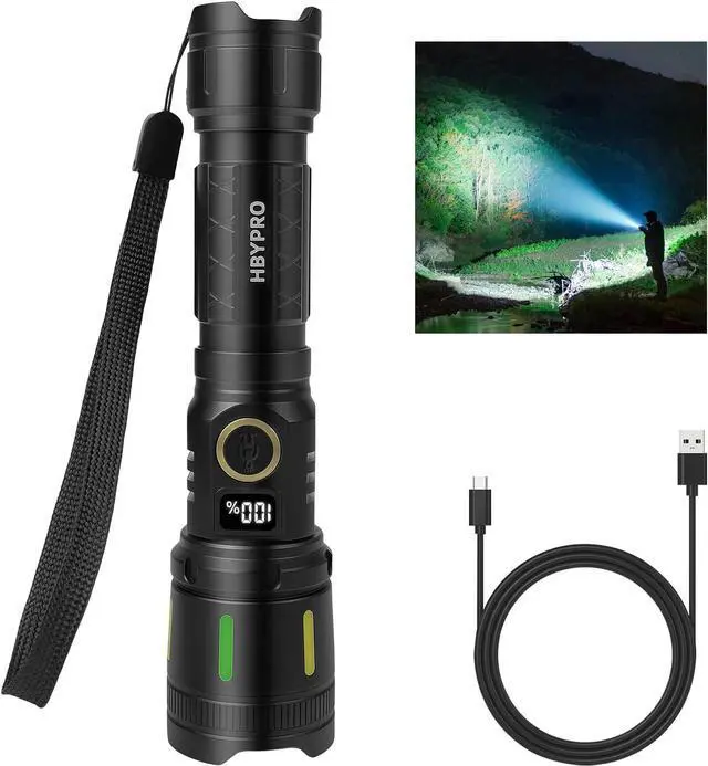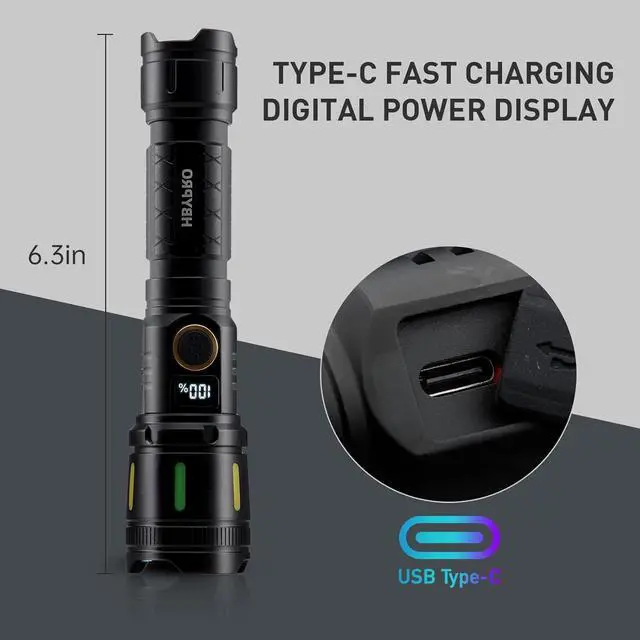 Rechargeable & LED Display: The handheld flashlight comes with Type-C charging port which can be connected to power bank, computer, car charger, wall charger, etc. It also has digital dispay to show the remaining battery capacity, you can always easily and accurately know when to charge the flashlight.