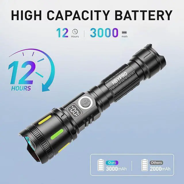 Super Bright & High Illumination Distance: The super bright flashlight is equipped with an upgraded LED chip 990, 000 lumens, it can illuminate the darkness with ease, providing the brightness you need to see clearly. Up to 1000ft illumination distance under the focus spotlight.