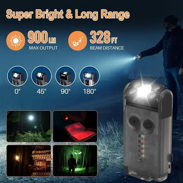 Versatile Lighting Modes - 12 working modes and various color lights in a mini flashlight, controlled by 2 buttons, easy to operate. 4 white light modes+1 red light mode+1 365 UV light mode for the main light, various colored light modes for the side lights (white/red/warm/green/red blue flashing)as well as a 120 DB buzzer mode, suitable for your different lighting needs, ensuring powerful illumination in any situation.