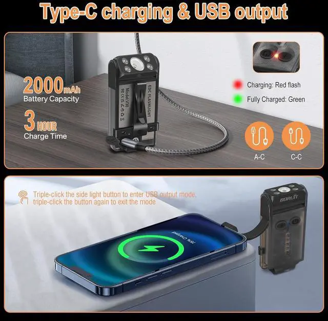 Newest Flat EDC Flashlight - BORUIT V30 is the newest small EDC flashlight in our V-series, adopts(1pcs white +2pcs 365nm UV+ 2 pcs red)main light + COB colored side lights, brightness up to 900 lumens and irradiation distance up to 328 feet, Whether for everyday use, nighttime searching, counterfeit detection, or outdoor camping hunting hiking, boruit V30 black light flashlight provides a professional-grade, multifunctional lighting solution.