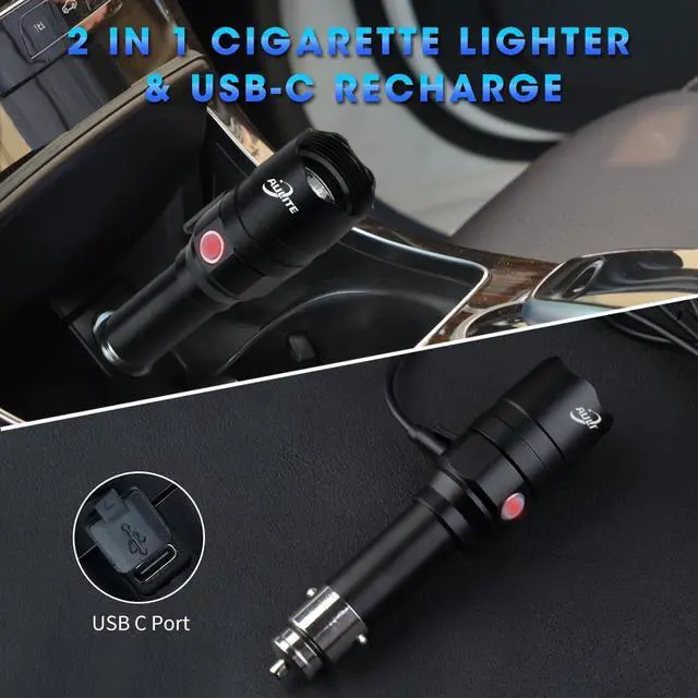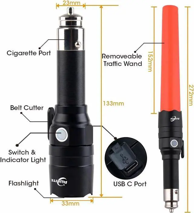 {Removable Traffic Wand} It is easy to install the orange wand by hand, and the safety signal is highly visible during the day and night. {Cigarette Lighter & USB C Rechargeable} Everywhere recharge in the 12V DC car cigarette socket, 5V DC USB C port. {Powerful Flashlight} The torch offer 500 high lumens light output, with 30%, 100%, warning strobe modes. {Small & Lightweight} Every day carry design that makes it easily stay in your car, backpack, holster, case... {Versatile Tasks} Nice gadget for vehicle inspection, emergency, traffic control, roadside warning and halloween decorations, ideal gift for car owners, drivers, travelers...