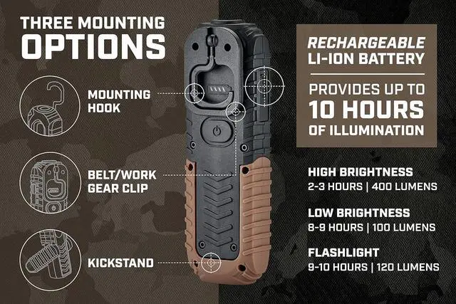 Portable 2-in-1 work light includes a 15 lumen flashlight for focused worksite lighting