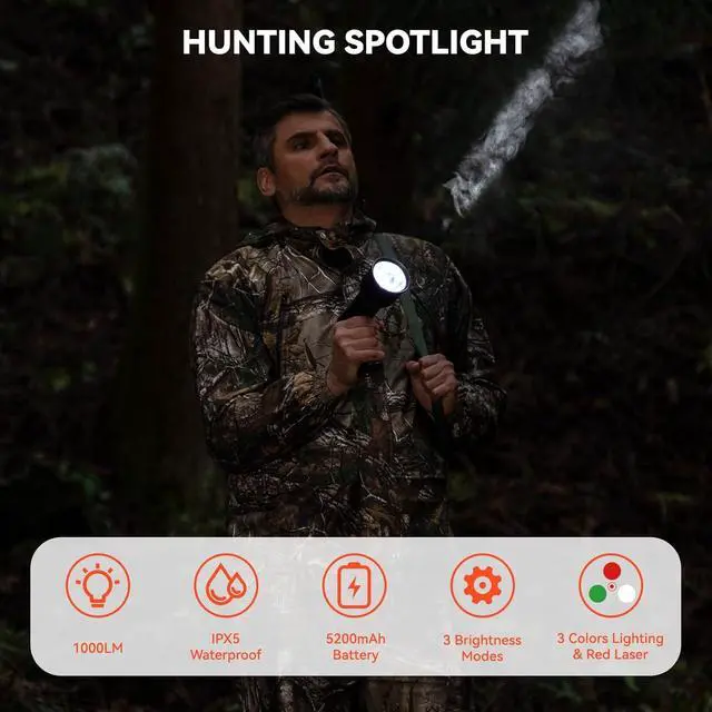 3 BRIGHTNESS + 1 RED LASER MODES: Whether you require a high-intensity beam for long-range visibility or a softer light for close-range tasks, the spotlight has 3 different lighting modes(High/Mid/Low) to meet all your needs. The red laser light is an invaluable tool for precise aiming in hunting, reaching up to 500 yards during daytime and extending to an impressive 800 yards in low-light conditions.