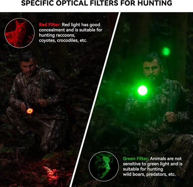 EFFECTIVE HUNTING DESIGN: The spotlight features a tactical red dot sight that enables precise aiming at targets up to 500 yards away. Additionally, the spotlight is equipped with red and green lenses, which are ideal for scanning and detecting coyotes, predators, coons, varmints, and hogs in low-light conditions.