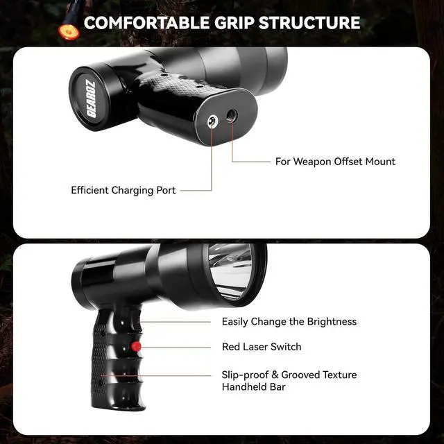 PREMIUM METERIAL: Crafted from high-quality aircraft-grade aluminum alloy, GearOZ handheld hunting light is durability and longevity. The aluminum alloy body not only provides exceptional strength but also offers resistance to abrasion. Additionally, the spotlight is designed with IP68 waterproof level, offering protection against water erosion and heavy raining weather.