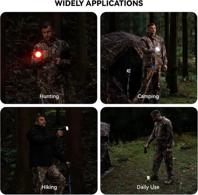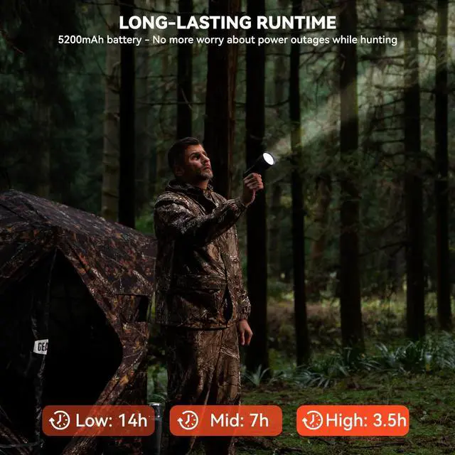 RECHARGEABLE: Powered by high-capacity 5, 200 mAh rechargeable batteries, this flashlight ensures long-lasting illumination during your hunting adventures. For added convenience, the spotlight comes with both a home charger and a car charger, allowing you to easily recharge the batteries wherever you are.