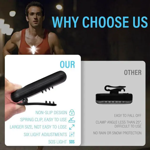 Clip on Light for Running: Spring clip design, securely fastened to prevent dropping during use. Simply clip it on to your hat, clothes or backpack and enjoy your favourite activity without holding a light.