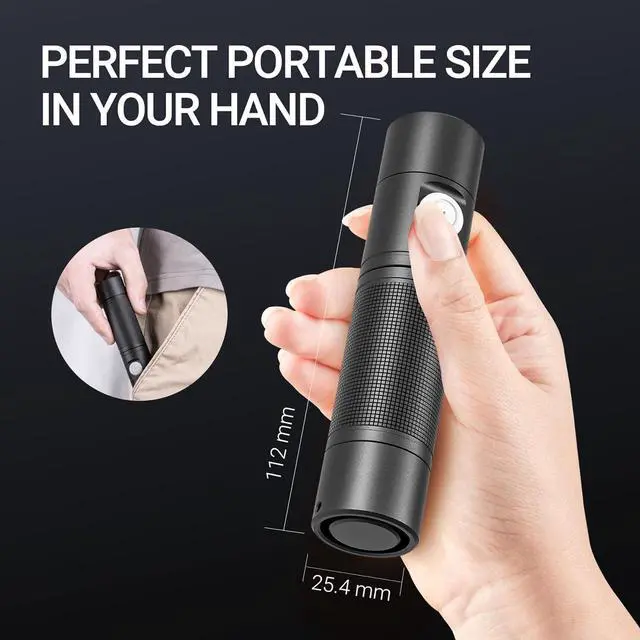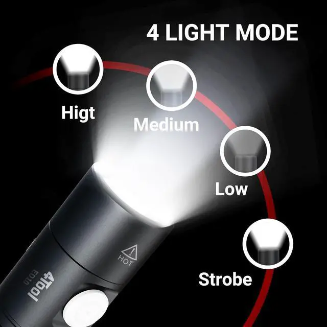 4 LIGHT MODES4Tool LED rechargeable flashlight with 4 light modes: 1400 lm (200 m) for 3 h 30 min, 420 lm (107 m) for 5 h 30 min, and 25 lm (26 m) for 100 h. Strobe. different lights to suit different needs, up to 100 hours of extra long use. One-touch switch, press for 2 seconds to turn it on or off, press lightly to change the light mode. Powerful and easy to use, can be charged directly with the matching Type-C charging cable.