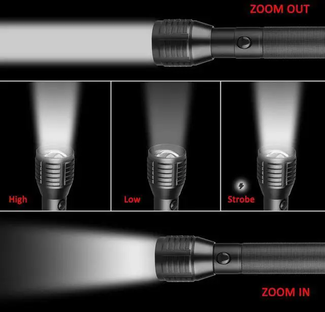 3 Mode: High, Low, Strobe, With ON / OFF button / Zoom in & out
