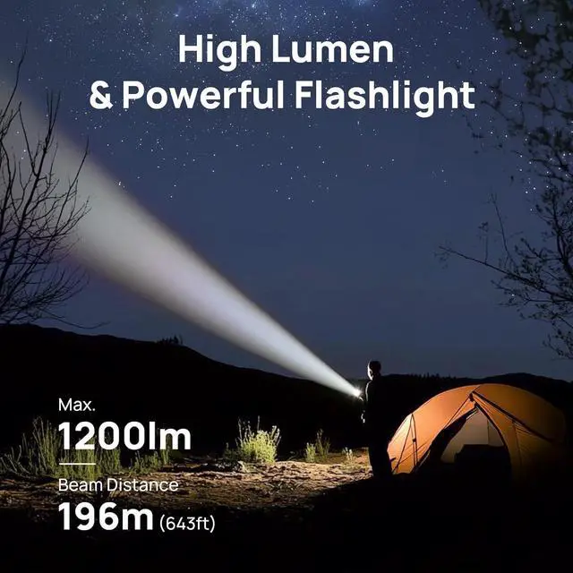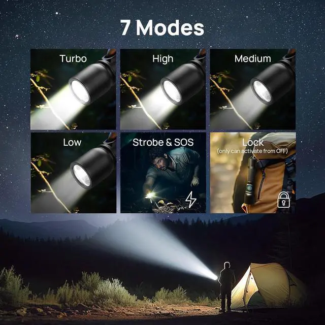 7 ModesIt provides 7 light modes: turbo/high/medium/low light, and strobe/SOS/lock mode. The brightness from low light to turbo/strobe light is 20-1200 lumen. The lock mode can prevent your flashlight runs out the battery due to accidentally turned on when carrying, or protect the children eyes from directly looking the light.