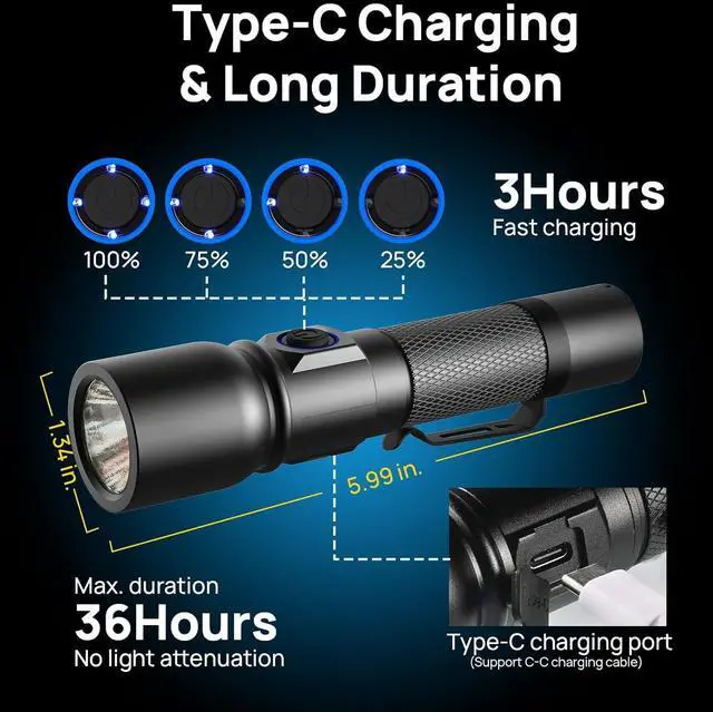 Rechargeable FlashlightConsciot rechargeable flashlight comes with a USB-C charging cable. Product dimension is 1.34 * 1.34 * 5.98 inch. The maximum runtime in low light level can reach 36 hours, which is perfect for emergency use. Each lighting mode can be accessed individually, no more annoying mode cycle. Plus brightness memory function, once settled, just need one click to on/off without consideration. ***** Please press four times to unlock the light when you received the product, since it was set to lock mode to protect the battery life in the transit.