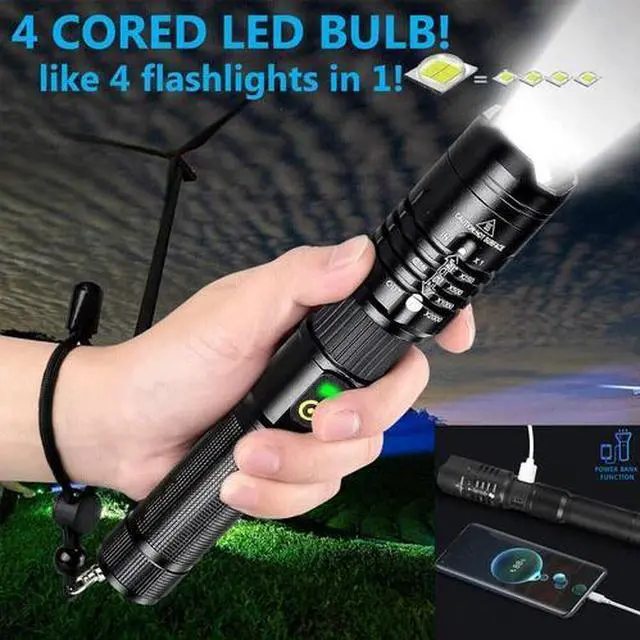 [Super Bright Flashlight]Our 990000 lumens tactical flashlight utilizes the durable XHP50 LED chip,provides poweful light,4 times brighter than T6 flashlight.Max beam distance up to 500 meters (1640ft).With a lifetime up to 50,000 hours.Attention:You need get it fully charged before use.please make sure the battery "+" face the inside.
