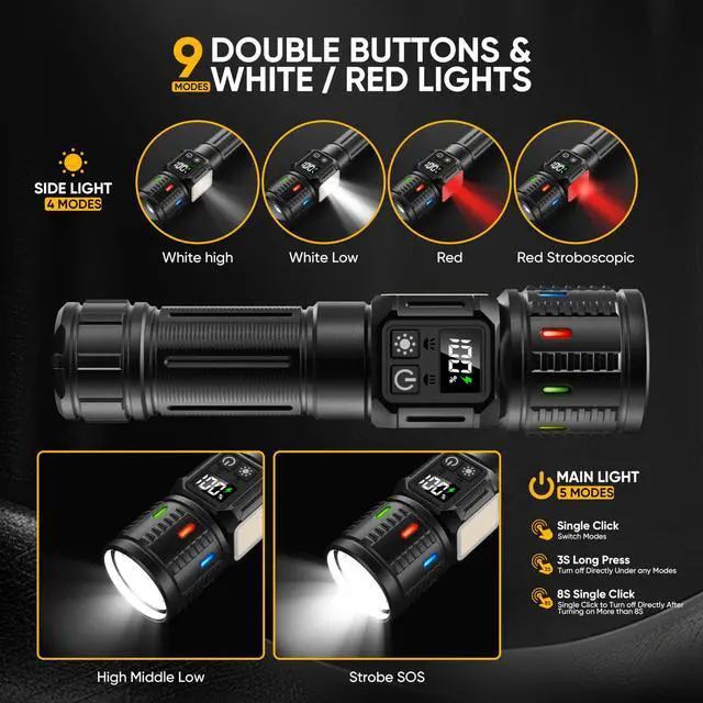| Light Modes | Brightness adjustable - 9 Modes with Side Light & Red light option |