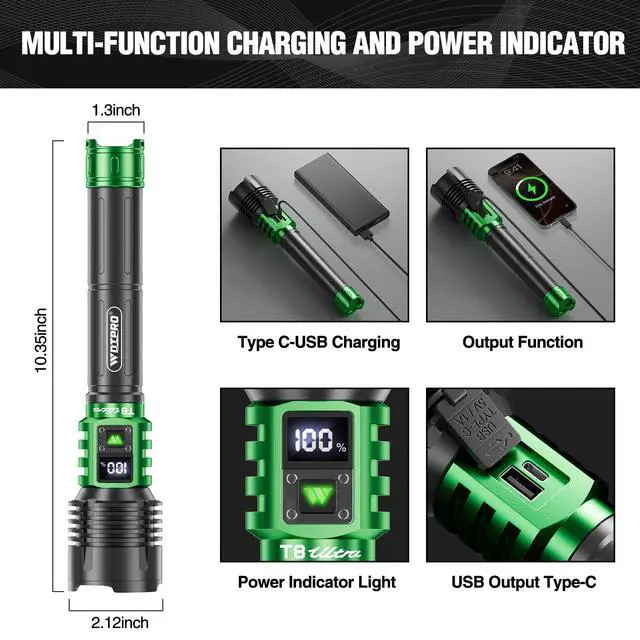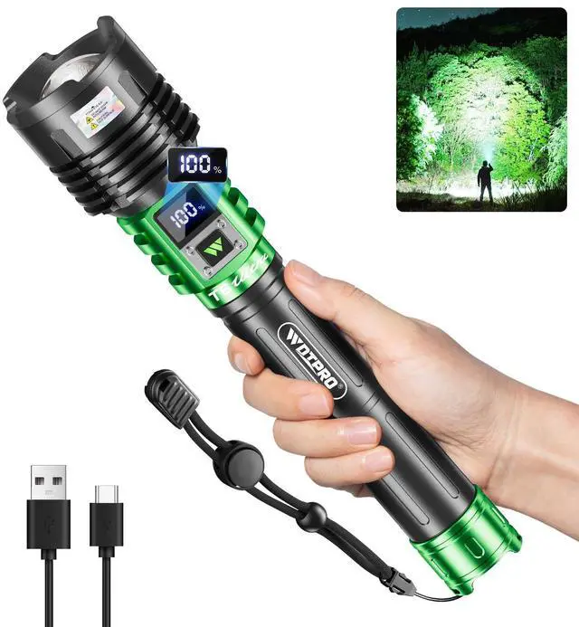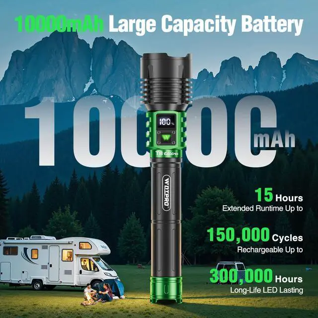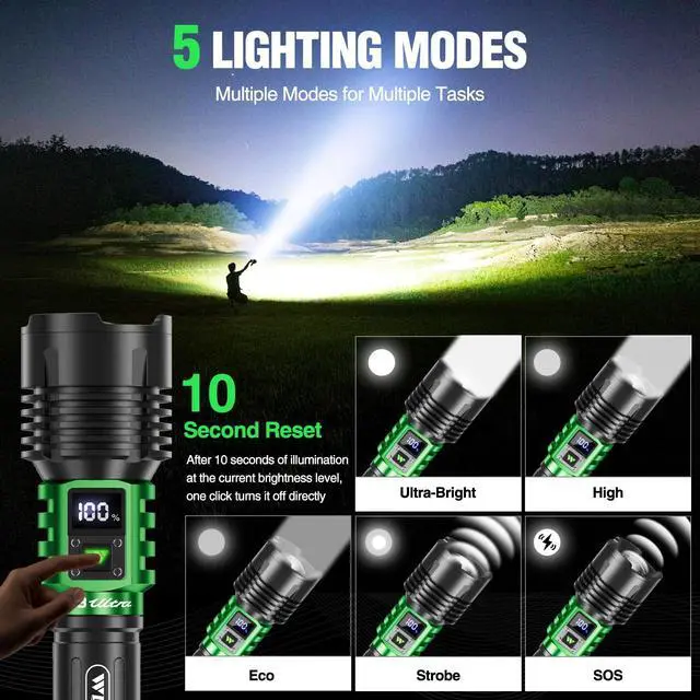 Upgraded High Lumen LED Flashlight: Our strong R&D team has upgraded this product to address the shortcomings of similar rechargeable LED flashlight on the market. Made from aircraft-grade aluminum alloy, it boasts a brightness of up to 90,000, a brighter and wider beam reaching nearly 3,280 feet and illuminating an area of 2,000 square feet. The LCD battery indicator clearly and accurately displays the remaining battery life, ensuring you always know when the battery life is up