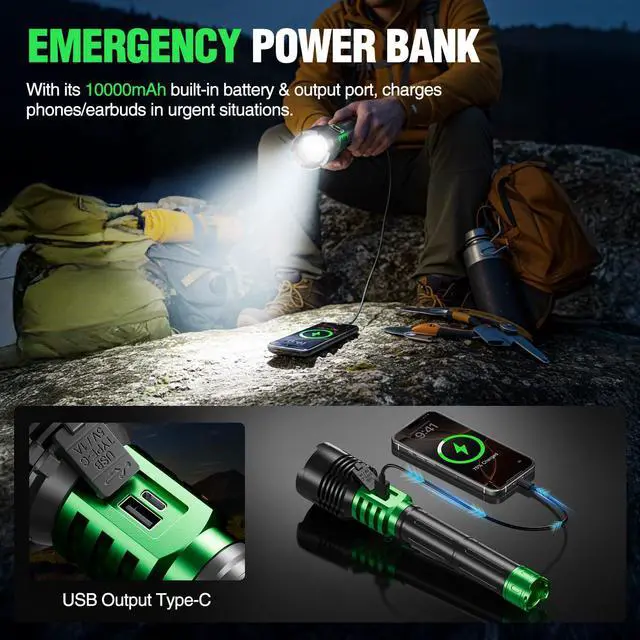 High-Capacity Rechargeable Flashlight: Bright flashlight is equipped with a 10,000 mAh rechargeable battery and a built-in USB output port, which can double as a portable power bank to charge your phone and other devices, making it perfect for outdoor adventures and camping travel. The USB-C fast charging port ensures the tactical flashlight charges in just 3-4 hours and has a battery life of up to 15 hours under normal use