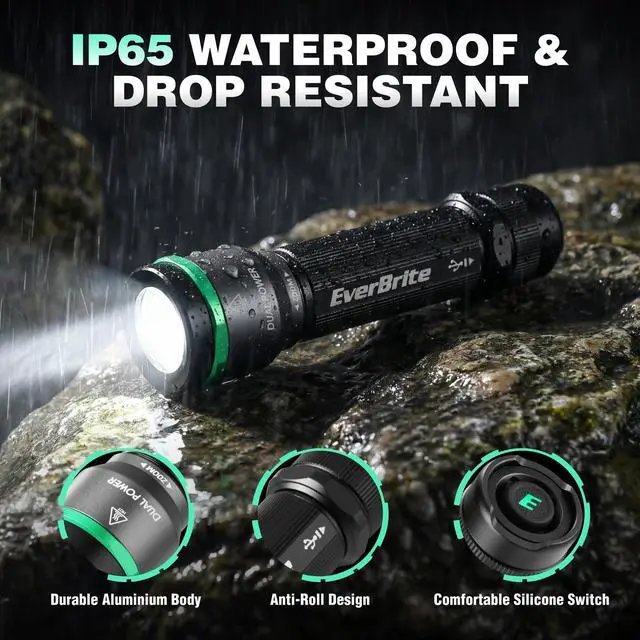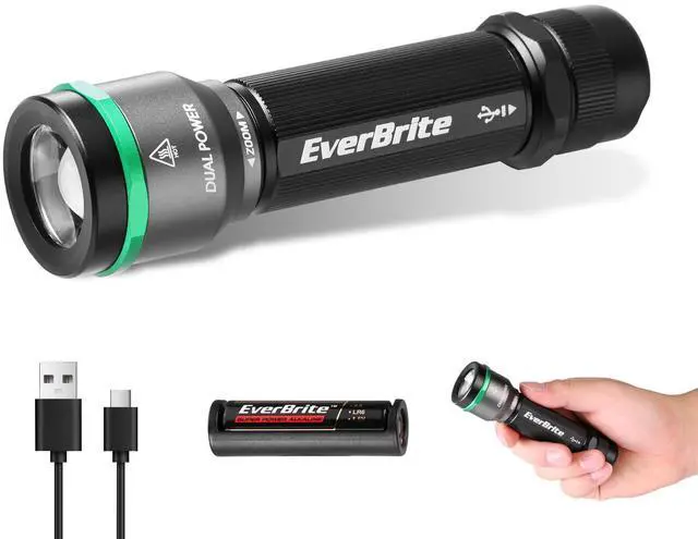 Adjustable Light Modes, Adjustable Focus, Durable, High Lumens, Aluminum, lithium_ion, 1, 1.34 L x 1.34 W x 4.72 H inches, 0.3 pounds, water_resistant, Manufacturer warranty for 1 year from date of purchase., EverBrite, EverBrite Dual Power Zoomable Flashlight