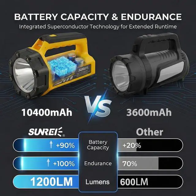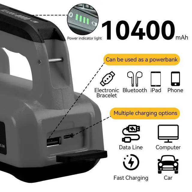 The flashlight features a built-in 10,400mAh ultra-large capacity lithium battery. It can be fully charged in approximately 4.5 hours via the included Type-C cable. More than just a light, it serves as an emergency power bank to charge your phone