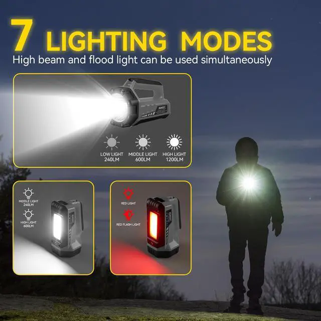 The side COB light provides wide-angle flood lighting, ideal for close-up tasks like car repairs or reading. It features 4 modes: High White, Medium White, Solid Red, and Flashing Red.safety signal for outdoor rescue, storms, or roadside emergencies