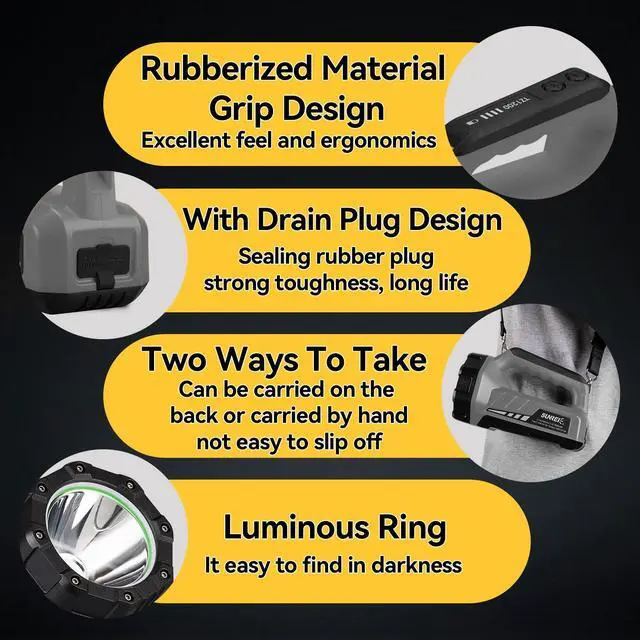We’ve integrated a luminous silicone seal that glows in the dark, allowing you to locate the flashlight instantly. Weighing just 1.5 lbs, it features an ergonomic non-slip handle and comes with an adjustable shoulder strap