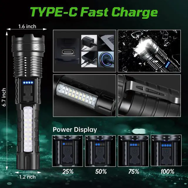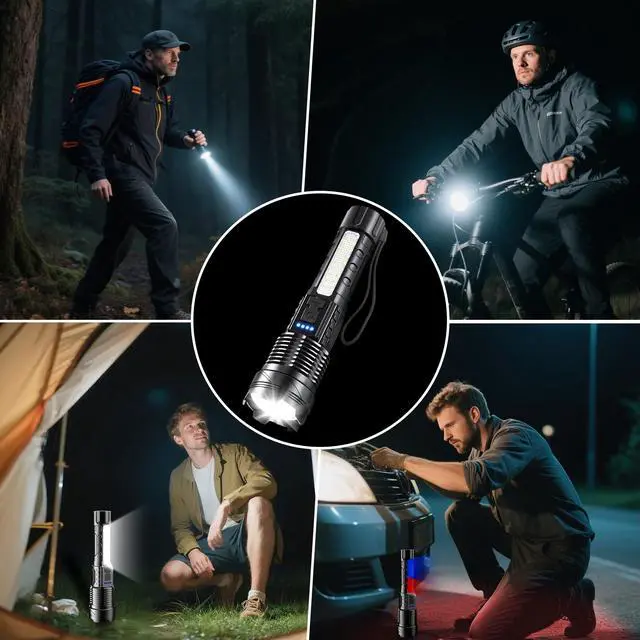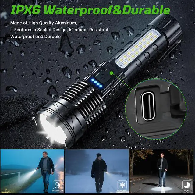 Illuminate Your World with the Ultimate Rechargeable LED Flashlight Discover the power and versatility of our Rechargeable LED Flashlight, engineered to deliver super bright, high lumens illumination for all your lighting needs. Whether you're camping in the wilderness, preparing for a home emergency, or tackling tactical missions, this handheld flashlight is your go-to source of reliable light. With a robust design, advanced features, and user-friendly functionality, its the perfect lighting solution for indoor and outdoor enthusiasts. Key Features & Selling Points: Ultra-Bright LED & High Lumens Output: Equipped with an upgraded LED chip, this flashlight produces an astounding 9000 lumens, making it one of the brightest flashlights on the market. It offers exceptional visibility as a spotlight for long-distance observation and a floodlight for wide-area illumination, ideal for camping, hiking, and emergency situations. 7 Lighting Modes & Zoomable Focus: Tailor your lighting to any scenario with 7 versatile modes: main ligcy preparedness. Why Choose Our Flashlight? Our Rechargeable LED Flashlight combines high lumens output, durability, and convenience in one compact package. With its USB-C charging, zoomable focus, and waterproof design, it outperforms standard flashlights. The 2-pack offers exceptional value, ensuring you and your loved ones are always equipped with reliable, bright light. Order now and experience the ultimate in portable illumination! "Whether you're navigating a blackout, trekking through the wilderness, or tackling nighttime repairs, our high-lumen LED flashlight is engineered to outperform. With 7 Versatile Modes & Zoomable Focus, USB-C fast charging. This allows you to use it for home, emergencies, camping, hiking, work, indoor, outdoor and many other scenarios Zoomable Beam: Adjust from a focused spotlight to a wide floodlight in seconds. Fast USB-C Charging: Compatible with power banks, cars, or wall adapters. The battery indicator eliminates guesswork. Built to Last: IPX6 waterproof rating and shockproof design thrive in rain, snow, or harsh environments. Designed for Convenience: Clip it to your backpack or use the lanyard for easy access during hikes, night runs, or repairs. Ideal For: Outdoor enthusiasts, preppers, homeowners, and professionals needing a reliable, bright, and portable flashlight. Outdoor Enthusiasts Bright enough to light up trails, campsites, or fishing spots. Preppers & Homeowners Trustworthy
