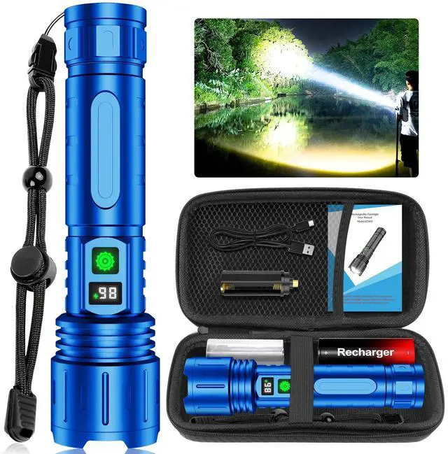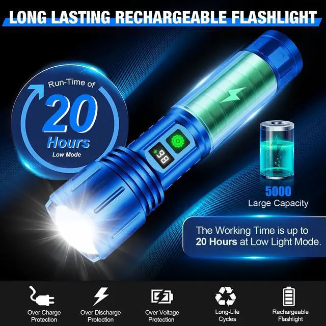 - Large-Capacity Rechargeable Ba-tt-er-y & Long-Lasting Use: When the power goes out suddenly at night, or there is an emergency repair, a ready-to-use LED rechargeable flashlight is a must. This high lumen flashlight comes with a 5000 high capacity rechargeable ba-tt-er-y for longer lasting use. The powerful flashlight lasts up to 8 hours in high mode and up to 20 hours in low mode. Made of waterproof and drop-resistant super hard aviation-grade aluminum alloy materials, it's perfect for use in emergencies.