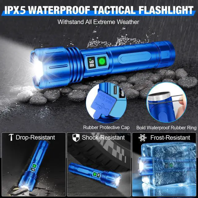 IPX5 Waterproof: The tactical flashlight can be used in rain, heavy snow, earthquake and other emergency situations.