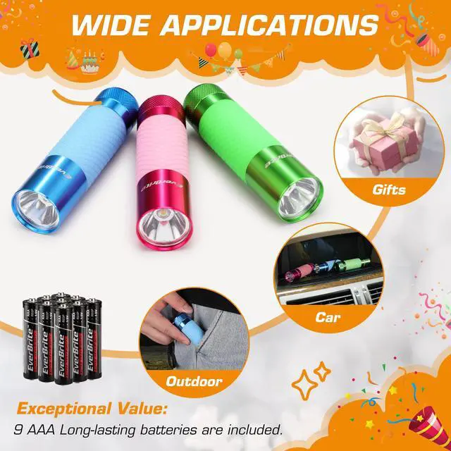 Assorted Color: This EverBrite mini flashlights set comes in 3 colors - blue, green, and pink, including 9 x AAA batteries. You dont have to purchase the extra batteries, saving you time and money. Also, they can make great holiday and birthday favors