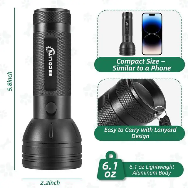 - Escolite’s upgraded LED bright blacklight powerful flashlight provides superior brightness and a wider detection range. This means you can easily spot hidden stains that others leave behind, saving you time and effort.
