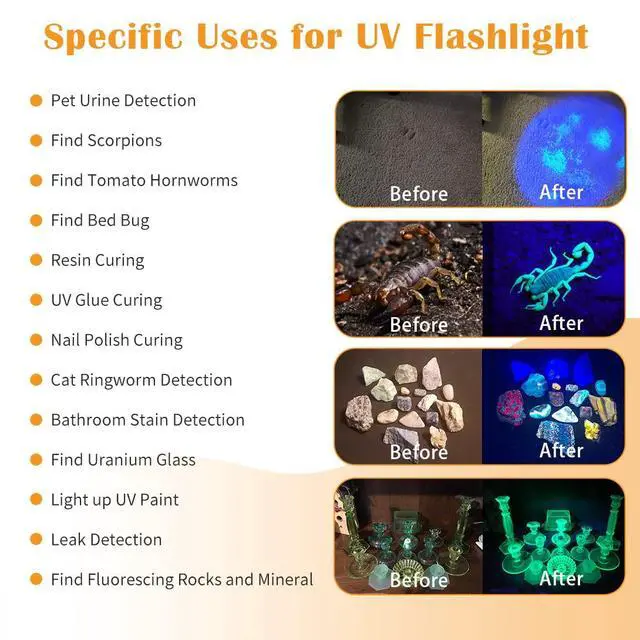 - Pet Urine Detection; Find Scorpions; Find Tomato Hornworms; Find Bed Bug; Resin Curing; UV Glue Curing; Nail Polish Curing; Bathroom Stain Detection; Cat Ringworm Detection; Leak Detection; Find Uranium Glass; Light up UV Paint; Find Fluorescing Rocks and Mineral (Opal, Yooperlite, Flourite, Sodalite, Calcite)