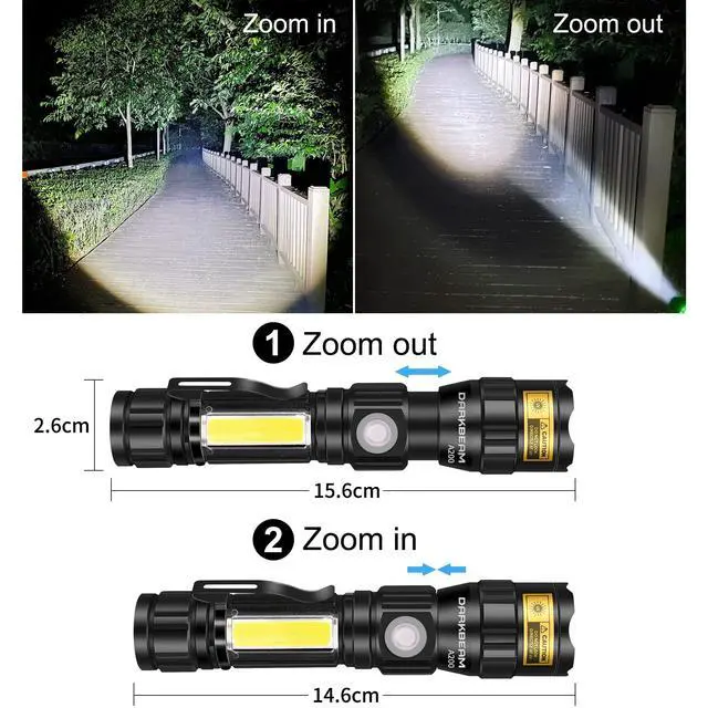 By pull the flashlight head to adjust the beam range from wide beam (large area lighting) to narrow beam ( long-distance lighting) .