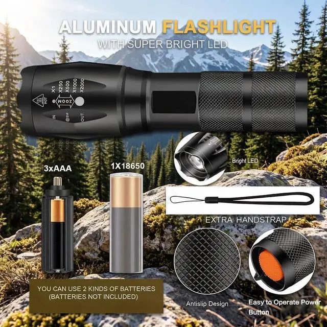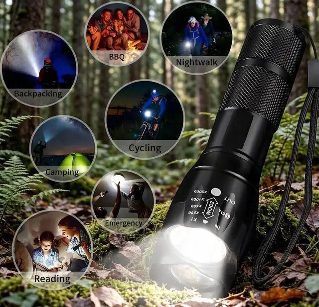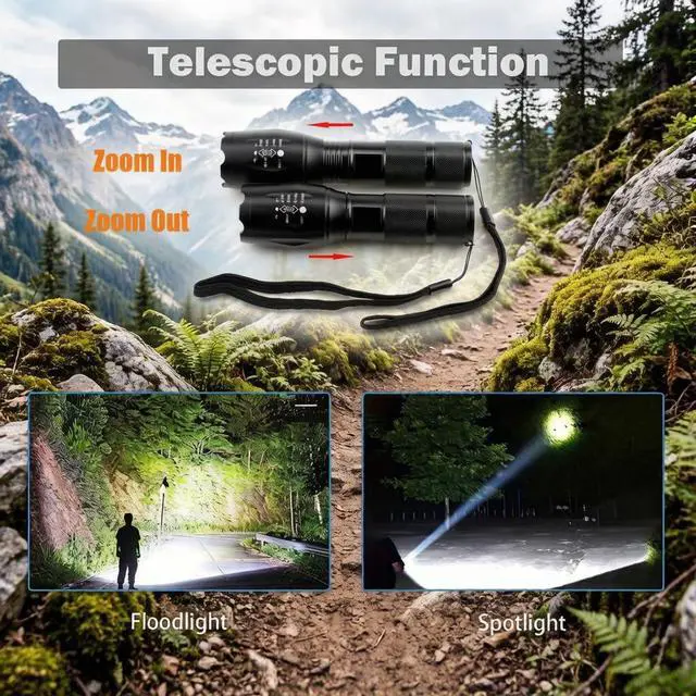 3. Focus zoomable: smooth zoom from a wide angle beam to narrow down. The zoomable design of the flashlight adjusts the focus as needed, giving you the freedom to choose a spotlight or floodlight for long distances or larger illuminated areas.