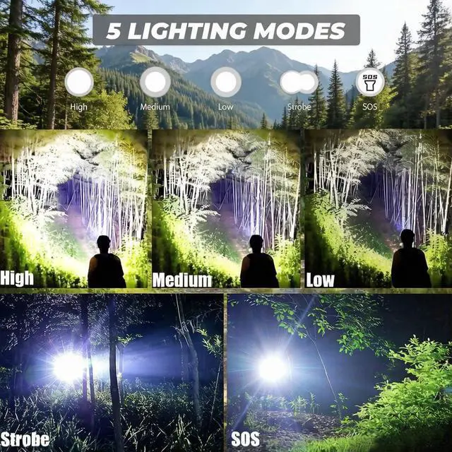 One button control of 5 lighting modes. This led flashlights with 5 adjustable modes (High, Medium, Low, Strobe, SOS/Emergency). It can provide a uniform high-brightness beam and a wider range of illumination to meet your daily needs.