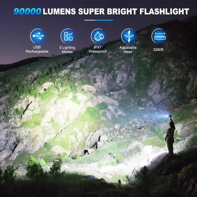 The KINGCAESAR super bright LED flashlight is here to light your way. Equipped with the latest and upgraded P90.8 chip, this flashlight radiates an astonishing 90,000 lumens of light and max beam range of 3280ft.