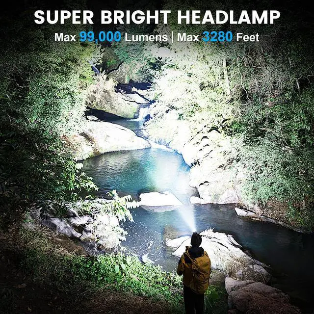 High-Lumen Power Beam99,000lm Power Headlamp, ideal for camping, work, and hiking. Illuminate trails, worksites, or campgrounds with a bright lumen beam. 3 lighting modes rechargeable headlamp is perfect for hiking, helmet lighting, emergency repairs, or as an adult's go-to headlamp in any low-light environment.
