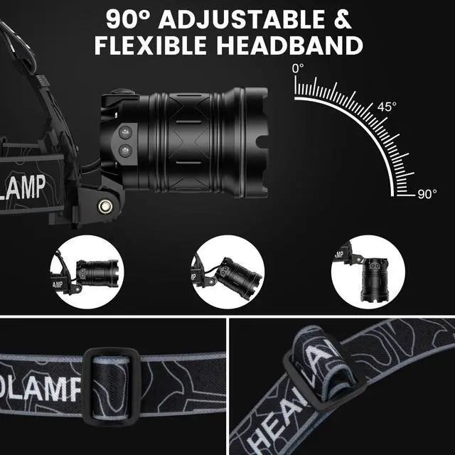 Adjustable Focus & 90° Angle: The flexible high-lumen headlamp features a freely switchable spot and floodlight mode; the 90° adjustable head provides versatile lighting angles to meet daily needs such as maintenance, walking, camping, and more.