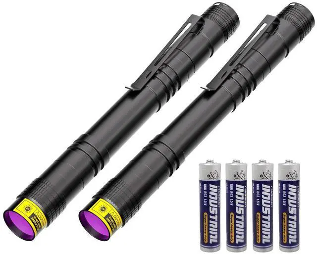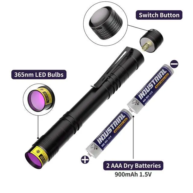 2 Pack UV Light Included 4AAA batteries You will get 2*blacklight penlights, each flashlight powered by 2*AAA batteries( Included 4AAA batteries), simply press the button to turn on/off the flashlight