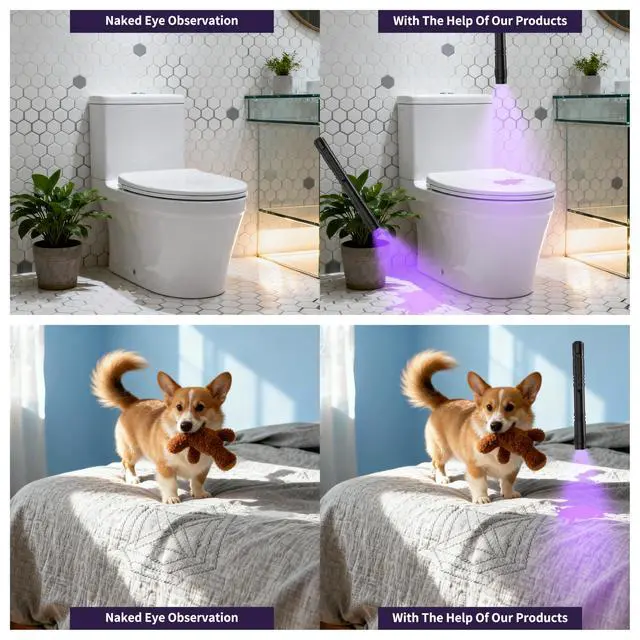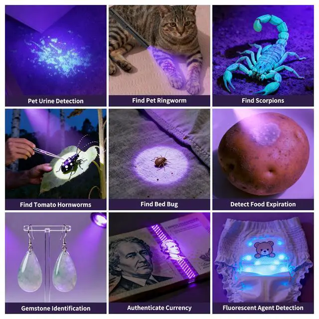 Versatile Tool for Everyday Inspection This UV blacklight flashlight helps you easily spot pet urine stains, leaks, scorpions, counterfeit money, and hotel cleanliness issues. A must-have tool for home cleaning, travel, or outdoor explorationcompact, reliable, and ready for any situation.