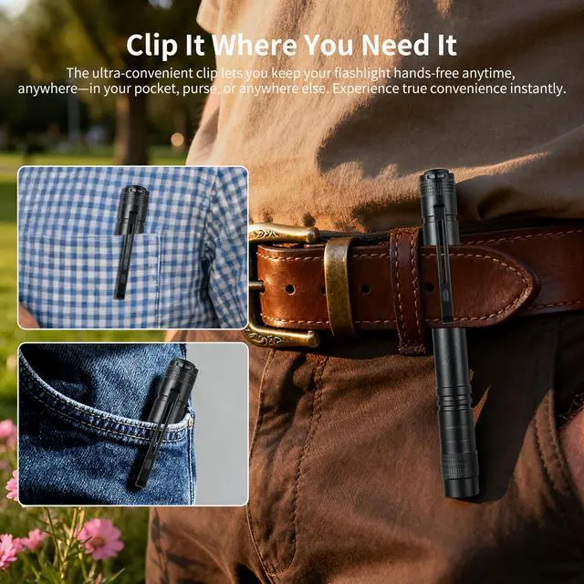 Lightweight & Metal Clip Measure in 5.1*0.55inch, weight only 1.1oz/pcs, is extremely lightweight for daily use. With the removeable metal clips, this LED pen light can be easily attached to your belt, pocket, bag or hat, take it anywhere you go. Free your hands when doing works or repairing.