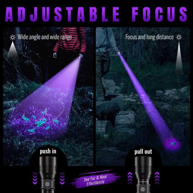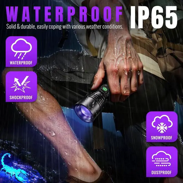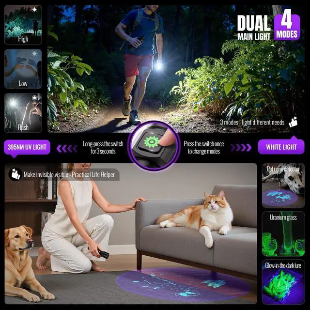 - Multi Functional LED Flashlight: 1. White light mode: for car maintenance, oxygen explosion, camping, hiking, night patrol, emergency use, etc. 2. UV-395NM: curing UV resin, 3D printing, searching for scorpions, bugs, hornets, detecting stains, jade, amber, detecting fluorescent agents, pet urine, mineral detection, etc.