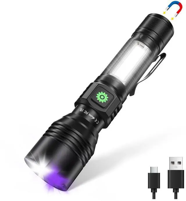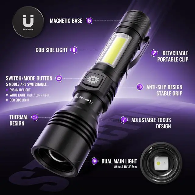 - 3 in 1 Dual-Light-Source Flashlight:White light+395 UV Flashlight and side COB(White Light), supporting focusing, magnetic attraction, and portable design.