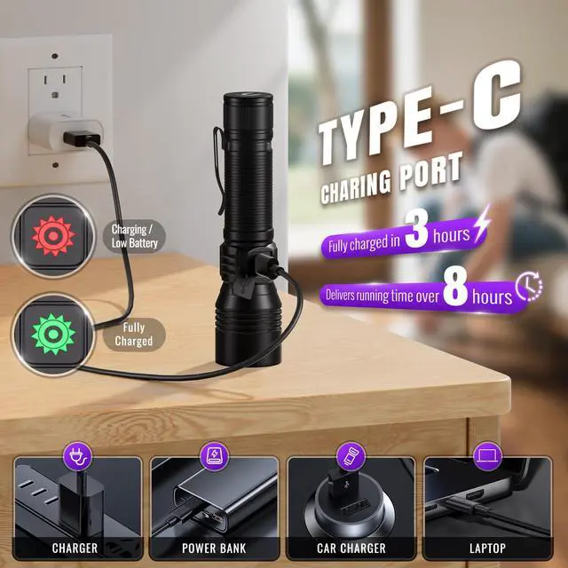 - Please charge the device promptly when the LED indicator light turns red, and prioritize using the provided USB cable to charge the device; If the LED indicator light turns green, it means the flashlight is fully charged. Please unplug the power plug at this moment.