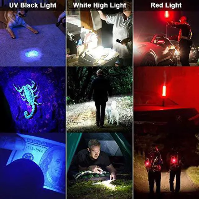 Tail cap of Blacklight flashlight design with magnet, allow you use this flashlight stick to all iron materials, will free your hands for some two-hands work: like auto repairing, checked power outage at night, inspection, detection and more.