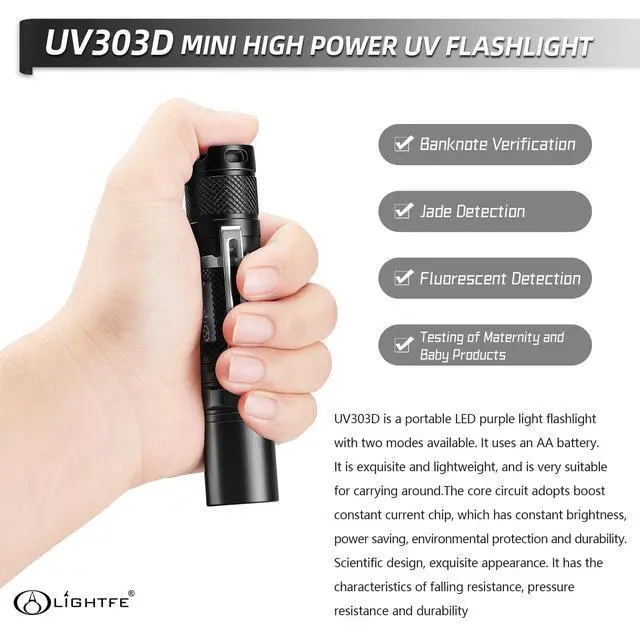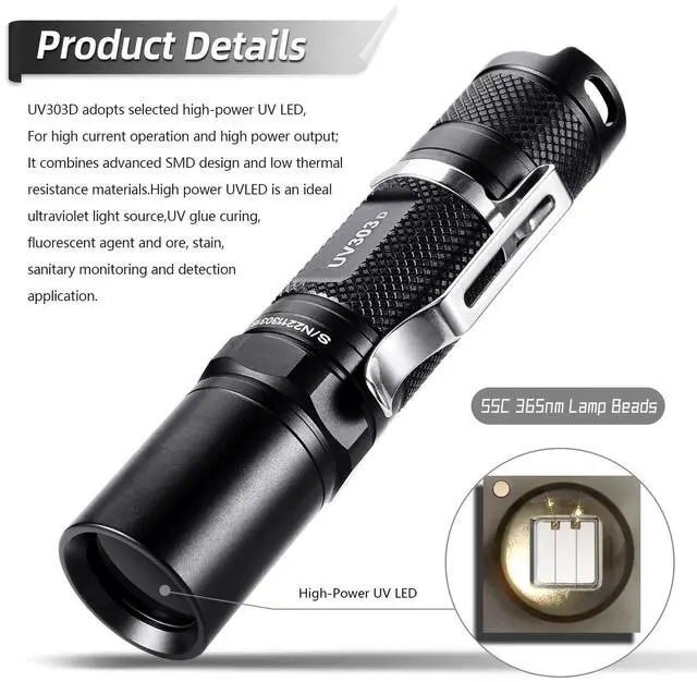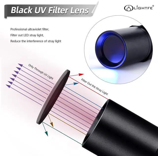 Equips with hard toughened black filter optical lens that eliminates most extraneous visible light (the visible light you see when you shine it on a surface is fluorescence). Latest plating technology aluminum alloy deep reflector cup make you get tight, strong and far light beam.