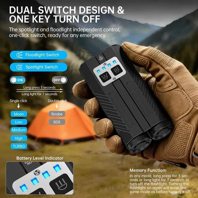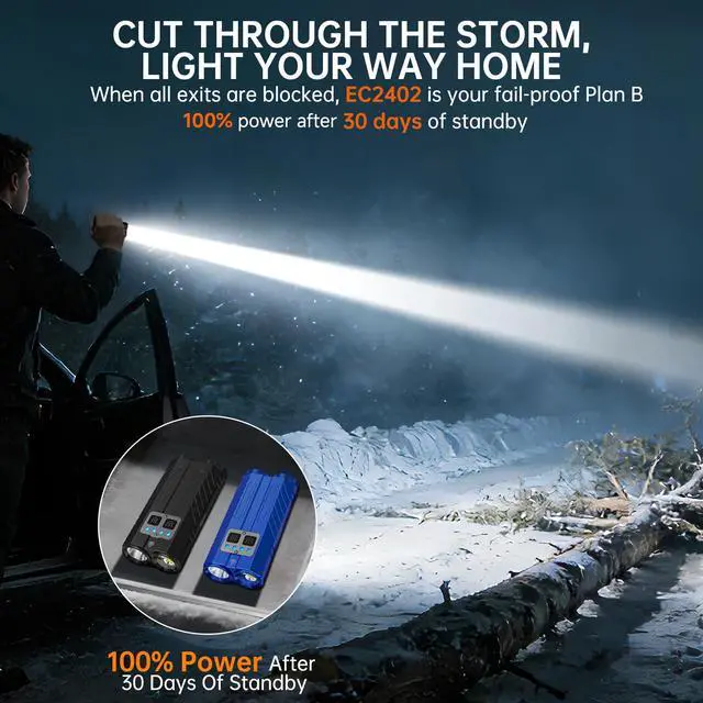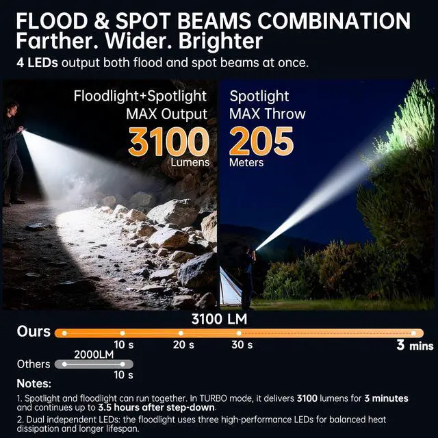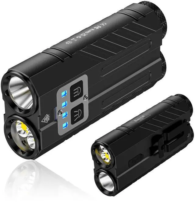 Small Powerful Flashlight and Dual Switch DesignBanral EC2402 high lumens edc flat flashlight features a dual switch and dual light sources design, the floodlight uses three high-performance LEDs for balanced heat dissipation and longer lifespan. Spotlight and floodlight can run together, in TURBO mode, it delivers 3100 lumens and reaches up to 205 meters. Floodlight for daily routines, spotlight for focused tasks.