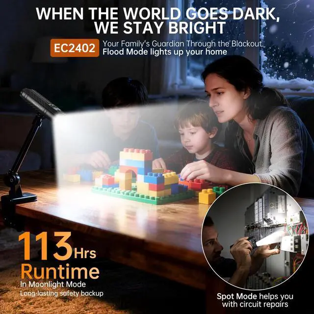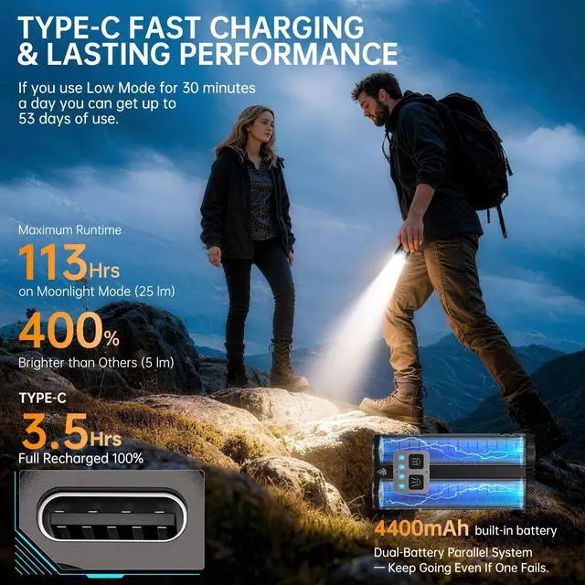 USB TYPE-C Fast Charging & Long-lasting RuntimeRecharge fully in just 3.5 HOURS via TYPE-C port. This USB rechargeable mini edc flashlight features are 4 battery level indicators (100% -75% -50% -25%), so you can know the power status at any time. Runs up to 113 HOURS of continuous runtime in Moonlight mode - The soft and balanced beam is perfect for night reading and taking care of children sleeping. Also provides reliable emergency lighting during hurricanes and power outages.