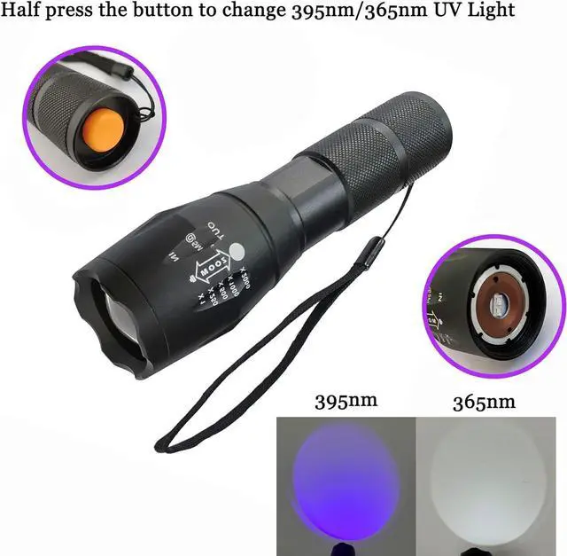 - The UV Flashlight with 365nm & 395nm UV Light Zoomable 2 in 1 Black Light LED Flashlight is really essential in our daily life,covering larger area without weaken the light, which is perfect for revealing dry dog, cat and rodent stains and smudgy spots that couldn't see with the naked eye and so on. No longer need to clean your carpets blindly, no more annoyed with the invisible stains on your bed, floor or kitchen's wall .