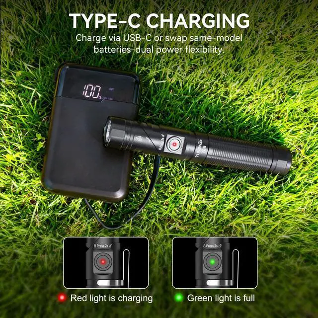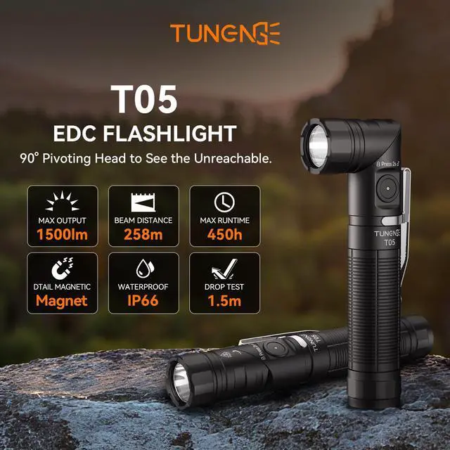 High Lumen Rotating Work Light: TUNENGE T05 flashlight combines powerful performance with a portable design. Featuring a high-quality SST40 LED and efficient reflector, it delivers a blazing 1500 lumens from its compact body (5.87 × 0.96 inches), with a beam reaching up to 846 feet. The 90 degree rotatable head allows flexible angle adjustment, making it ideal for outdoor adventures, vehicle maintenance, and daily emergencies. It's your reliable professional lighting companion.