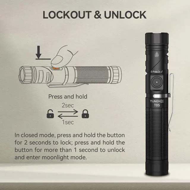 Lock/Unlock Mode: Press and hold the T05 flashlight switch for 3 seconds. The light flashes three times to enter lock mode. Press and hold for 1 second to unlock, preventing accidental activation in your pocket.